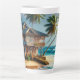 Pretty ai art with a big log cabin beach house on the ocean watercolor style with palm trees blowing in the breeze.