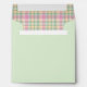Pretty pale green coloured square invitation envelope with a pastel pink, green, and yellow plaid pattern lining the inside. Dark grey custom return address is ready to personalize, on the back flap. Lovely finishing touch to our Plaid Couple's baby shower invitation.