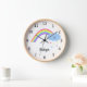 This is a very pretty clock for a little girl's room. It has a natural wood surround and a white background. It is decorated with digital art of a pretty pastel coloured rainbow, with a smiling cloud at one end, and pastel coloured raindrops. You can personalize it with her name. The clock has easy to read black numerals and black hands.