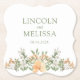 Pretty, modern and simple paper coaster features bottom floral spray with watercolor white and peach colour flowers and assorted sage and eucalyptus green leaves. Customize couple's name and wedding date in colour coordinated font
