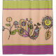 A pretty and colourful shower curtain featuring a beautiful peacock and flowers with a background of peach, green, and purple.