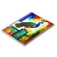 A vibrant and intricate peacock design blends elements from various artistic styles, featuring bold colours and detailed textures. The composition combines figurative art with abstract cubism, creating a visually striking piece.