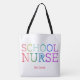 Personalized School Nurse Rainbow Typography Tote Bag. Watercolor texture rainbow letters spelling SCHOOL NURSE. Personalized with school, name or other information. Fun gift for your favourite school nurse. Colourful and modern typography. Design on both sides