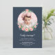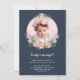 This beautiful birthday party invitation features your photo, framed by watercolor flowers in pink over a dark navy blue background.