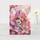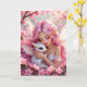 A pretty pink anime elven fairy holding her cute white baby dragon birthday card.