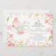 Pretty tea baby shower invitation featuring a tea pot & cups on a serving tray with a pink cake framed with beautiful flowers.
