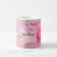 A mug with a photograph featuring a bouquet of pink and white carnations. Set on a dreamy ethereal background.