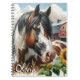 Pretty personalized notebook with a brown, black and white spotted horse surrounded by sunflowers and a rustic red barn in the background.