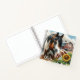 Pretty personalized notebook with a brown, black and white spotted horse surrounded by sunflowers and a rustic red barn in the background.