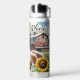 Pretty personalized water bottle with a brown, black and white spotted horse surrounded by sunflowers and a rustic red barn in the background.