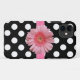 Pretty iPhone 5 phone case done in black with white polka dots. Realistic graphics of a pink grosgrain ribbon, with a pink Gerber daisy decorates the middle. Lovely way to be stylish and protect your phone at the same time. Customize to add any text you want.