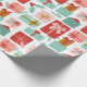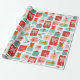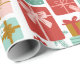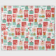 This wrapping paper features Christmas presents all wrapped up in red, pink and blue-green wrap.