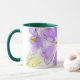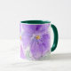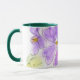 White mug, decorated with a watercolour design of Blue Geraniums and with a dark green rim and handle.