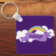 Beautiful purple keychain which features a cute cheerful rainbow with fun white clouds on a pretty violet background. Customize with a name for a great LGBTQ gift.