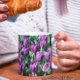 Enjoy your favourite hot or cold beverage in this large style coffee mug that features a wrap-around photo image of a garden of pretty, purple Tulips. A lovely, floral design for spring or any time of year!