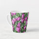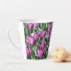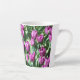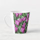 Chill out with a coffee latte in this ceramic mug that features the wrap-around photo image of a spring garden of pretty, purple Tulips. Select your latte mug size. A lovely, floral design for springtime!