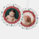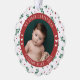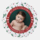 Pretty baby's first Christmas photo ornament with a round photo of your baby with curved text and a pretty red berry and greenery pattern and cute hearts.