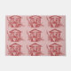 A red stamped design, featuring Mary, Joseph and Baby Jesus in the manger beneath a bright star against a textured red background.