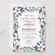 Christmas wedding invitation with your formal wedding wording in deep shades of blue and red inside a beautiful floral frame of Christmas flowers in red, white, and blue with greenery and berries. Floral winter wedding invitation with a beautiful floral frame.