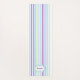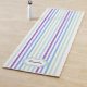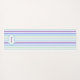 Personalized yoga mat done in a blue, purple, green and white striped pattern. Graphics of a decorative text area has custom text ready to personalize. Same design is featured on both the front and backside of the mat.