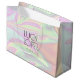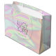 Elegant gift bag design featuring colourful faux holographic texture and elegant calligraphy font.