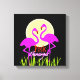 Trendy, cute and very summery picture on stretched canvas with two pink flamingos, wading through long grass with a big sun rising in the background.