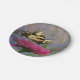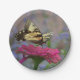 This paper plate features a beautiful swallowtail butterfly gathering nectar from a pink zinnia blossom.