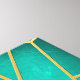 A dark turquoise mosaic framed with gold ribbing, reminiscent of a stained glass pattern.