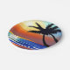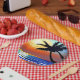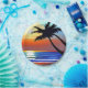 Birthday party plates. Vintage colours palm tree silhouette and ocean waves on a sandy beach ai generated artwork.