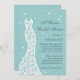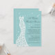 Delicate snowflakes and a romantic lace wedding dress accents this winter bridal shower invitation on a light turquoise background.