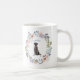 This lovely black lab mug features a trendy watercolor floral wreath, with pretty flowers and leaves in pink, peach, dusty blue, purple, and green. A watercolor illustration of a cute black Labrador Retriever dog sits inside, with a spot to add either your own name or that of your pet! The perfect gift for the proud dog mom.