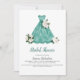 Pretty teal bridal shower design features teal dress accented by lush vibrant white roses.
