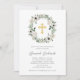 This simple and elegant religious Confirmation invitation features a wreath with pretty white and soft grey watercolor flowers, and green foliage and eucalyptus leaves, on a white background. A faux gold look cross is also featured.