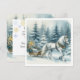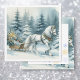 A pretty white horse walking with a festive sled on a winter day with snow-topped trees and a pretty serene scene. A sweet personalized holiday card to give you a warm and cozy vibe.