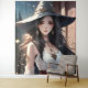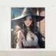 Pretty witch in a white dress wearing a pointed hat wall art tapestry. Perfect for getting into the spirit of Halloween.