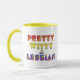 Are you pretty? Oh so pretty? Are you pretty and witty and Lesbian? Show your pride with this whimsical mug! The text reads: “Pretty witty & lesbian”. The lettering has a blend of colours from the Rainbow Flag. You can change the mug colour and/or style, if you’d like. Want this or a similar design on another item? Browse my Errant Gallery.