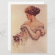 This design features an illustration by the American artist Harrison Fisher (1877–1934). It depicts a beautiful woman wearing an elegant evening gown. She is holding a pink rose in her hand and playfully teasing her pet kitten with it. The small cat looks mesmerized by the pink flower. The animal is holding its paw up in the air. The original artwork was painted by Harrison Fisher in 1909.