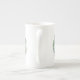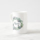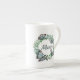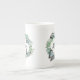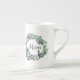 Elegant white bone china cup, with graphics of a pretty plant leaf wreath, with 3D looking butterflies and green text reading Mom. Lovely gift idea for mom on Mother's Day. Matching tea pot available.