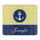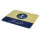 Beautiful cutting board with nautical anchor design, yellow & blue stripes and custom text.