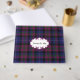 Plaid wedding guest book done in the classic regency blue, plum, green, black and white Pride of Scotland tartan plaid pattern. A white decorative oval text area, on the front of the book, has custom text ready to personalize for your wedding.