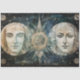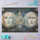 Greek God Style Art Celestial Primitive Painting featuring a Moonlit Night With Beautiful Faces In the Night Sky. in the style of primitivist art, illusory portrait, seascape.