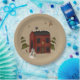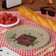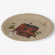 Primitive style paper plates show a traditional red colonial house with snow on the roof top. A whimsical snowman stands out front. Snow covered trees peak out from behind the house and stars twinkle in the sky.