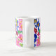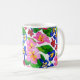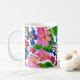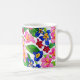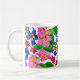 Une tasse blanche classique de 11 oz avec un motif peint à la main, tout en longueur, de primroses roses et bleues. Adaptée au lave-vaisselle et au four micro-ondes. Voir aussi carte de voeux, cadeaux et vêtements correspondants.