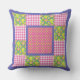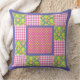 A chic Throw Pillow or Cushion, with a pretty pattern of deep pink, violet blue and yellow primroses on a leafy green background, teamed with deep pink and white check gingham and a pattern of yellow primroses and green polka dots on a deep pink background; from the Posh & Painterly "Primroses" collection.