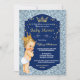 Royal blue damask with vintage baby doll illustration, faux gold crown and confetti.