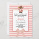 Princess themed baby girl's first birthday party invitation done in a peach and ivory striped background. A white text area has graphics of a cute teddy bear princess, at the top and a light peach coloured bow, at the bottom. Personalize all the text for your baby girl's special day.