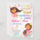This princess invitation features two happy little princesses in pink dress, coloured garland at the top, some flowers and rainbows around.