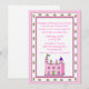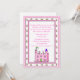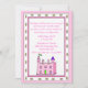 Jolie invitation de fête d'anniversaire de la princesse. Des graphiques doux d'un château de dessins animés rose décorent le fond, et une belle bordure fleurie rose et verte autour de l'invitation. Le texte en rose est prêt à être personnalisé pour la journée spéciale de votre petite princesse.