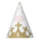 Personalized birthday party hat for a princess party that looks like you're wearing a gold crown with the birthday girl's age and name custom printed at the top of the hat.