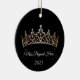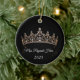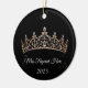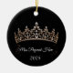This ceramic ornament is shown in a round shape with a sparkling crystal tiara with white text on a black color background.
